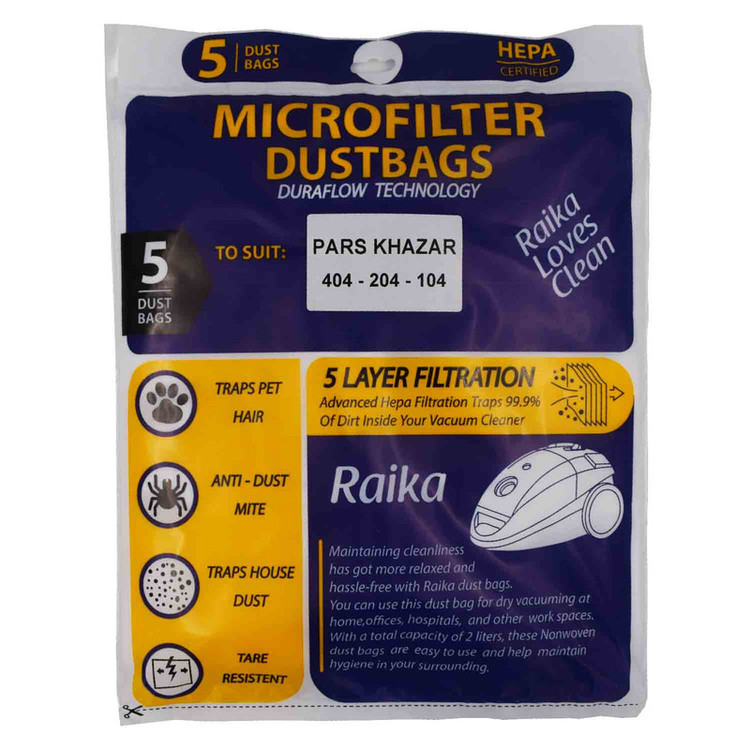 کیسه جاروبرقی یکبارمصرف رایکا با 5 لایه هپا در هر طرف تهیه شده که بااستفاده از فناوری اولتراسونیک به یکدیگر متصل شدهاند. بافت منسجم این کیسه و عدم وجود شکاف در محل اتصال از ورود ذرات به موتور و درنهایت هوای داخلی اتاق ممانعت کرده و موجب افزایش عمر دستگاه، مصرف کمتر انرژی و بهبود قدرت مکش میشود. این محصول مناسب جاروبرقیهای پارس خزر 104 است و در بستهبندیهای 5 عددی نایلونی ارائه میشود.