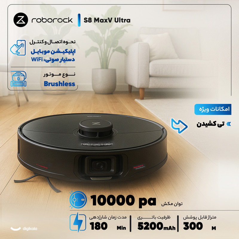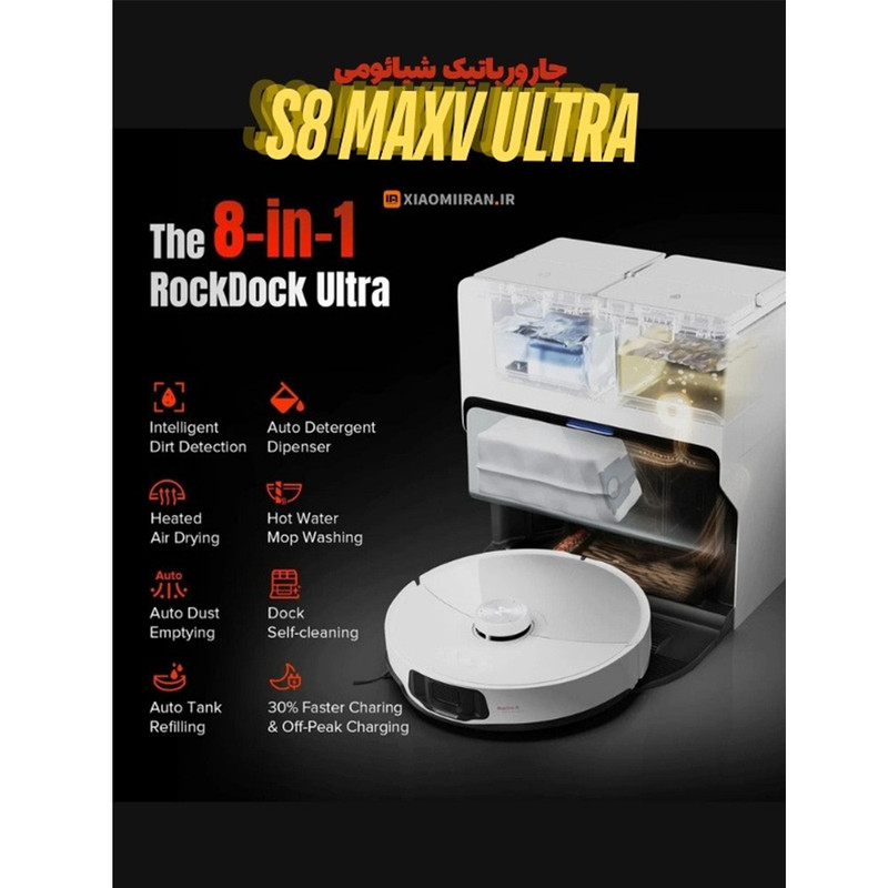 حالا بریم سراغ S8 MaxV Ultra که یکی از جدیدترین و پیشرفتهترین مدلهای جارو برقی رباتیک شیائومی است. این مدل با طراحی متفاوت و تکنولوژیهای پیشرفته خود، توانسته توجه بسیاری از خریداران را جلب کند. یکی از نقاط قوت اصلی S8 MaxV Ultra، سیستم ناوبری دوگانهی آن است که از لیزر و دوربین استفاده میکند. این سیستم به دستگاه کمک میکند تا با دقت بیشتری موانع را تشخیص داده و از برخورد با آنها جلوگیری کند. همچنین، این جارو برقی رباتیک دارای سیستم تشخیص موانع هوشمند است که به طور خودکار ارتفاع موانع را تشخیص داده و از آنها عبور میکند. این دستگاه دارای بدنهای مقاوم و با کیفیت است که علاوه بر زیبایی، دوام بالایی نیز دارد. طراحی مدرن و براق آن باعث میشود تا به راحتی در هر خانهای جلب توجه کند. همچنین، این مدل دارای یک صفحهنمایش LED است که وضعیت دستگاه را به صورت زنده نمایش میدهد.