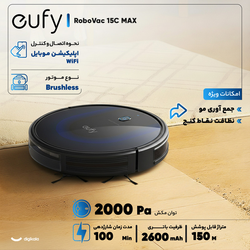 جاروبرقی هوشمند رباتیک یوفی مدل eufy RoboVac 15C MAX یک محصول شگفت انگیز جدید از کمپانی Anker است که به راحتی هنگامی که شما در منزل نیستید و یا حتی هنگام حضور شما به صورت خودکار سطح خانه شما را تمیز میکند.