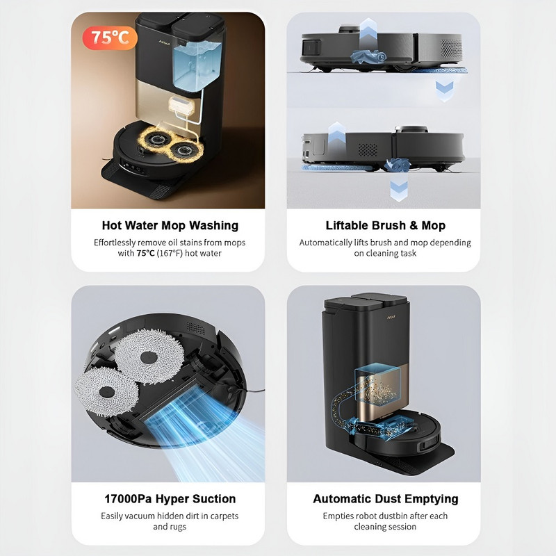 Airbot X40 Ultra یک همراه نظافتی قدرتمند است که با قدرت مکش ۱۷,۰۰۰ پاس و فناوری نوآورانه AirGPT™، نظافت را برای شما آسان و کامل میکند. این دستگاه با ویژگیهای پیشرفتهاش، به شما کمک میکند خانهای تمیز و سالم بدون هیچ زحمتی داشته باشید. با قدرت مکش ۱۷,۰۰۰ پاسکال که قابل تنظیم است، Airbot X40 Ultra به راحتی میتواند گرد و غبار، آلودگیها، و موهای حیوانات خانگی را از تمامی سطوح جمعآوری کند. این قدرت مکش بالای دستگاه حتی ذرات ریز و سخت را نیز از بین میبرد. سیستم AirGPT™ AI به این دستگاه اجازه میدهد تا بهطور هوشمند در اطراف موانع حرکت کند. . این سیستم به جارو اجازه میدهد تا بهطور خودکار موانع را شناسایی کند، مسیرهای نظافت را بر اساس نوع کف و میزان آلودگی تنظیم نماید همچنین اشیاء را در اپلیکیشن Airbot Home علامتگذاری کرده و مسیرهای نظافت را بر اساس نوع کف و میزان آلودگی تنظیم میکند. این دستگاه بهطور خودکار عملکردهای نگهداری مانند تخلیه مخزن گرد و غبار، شستوشو و خشک کردن پد تی در دمای ۷۵ درجه سانتیگراد، پر کردن مخزن آب، و بریدن موهای پیچیده شده از برس رباترا انجام میدهد. در هنگام عبور از سطوح سخت وقتی به فرش میرسه ، پد تی بهطور خودکار بالا میرود تا از آسیب به فرشها جلوگیری کرده و نظافت بهینهای در تمامی نقاط خانه فراهم کند.همچنین پد بازوی بیرون رونده آن که به ربات اجازه میدهد تا بازوی پد تی را برای نظافت و تی کشی بهتر زیر مبلمان و گوشهها بیرون آورد ، بهطوری که هیچ نقطهای از خانه بدون نظافت نخواهد ماند. سطح نویز آن از 65-72 دسی بل می باشد . دستگاه مجهز به باتری 5200 میلی آمپر ساعتی میباشد و توانایی جارو کشی تا 160 دقیقه را دارد .