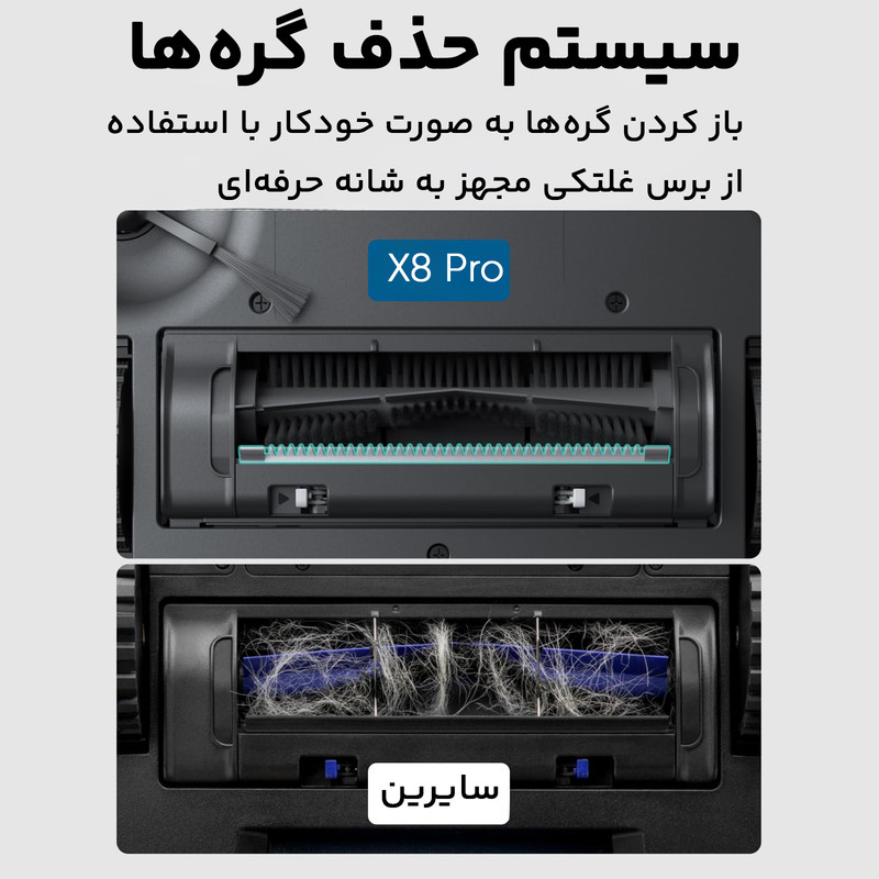 تمیز کردن برس غلتکی را به صورت دستی متوقف کنید. برس غلتکی ربات eufy vacuum X8 Pro دارای یک شانه Pro-Detangle است که به طور خودکار موهای در هم تنیده را پس از هر تمیز کردن از بین می برد. ربات جاروبرقی eufy مکش توربین دوقلو با قدرت 2×4000 پاسکال X8 Pro به راحتی موهای حیوانات خانگی را از اعماق فرش ها پاک می کند و آنها را تمیز و بدون مو می کند. تنظیمات نظافت خود را با ویژگی هایی مانند No-Go Zones، مرزهای مجازی و موارد دیگر سفارشی کنید تا تمیزی متناسب با فضای زندگی شما باشد.